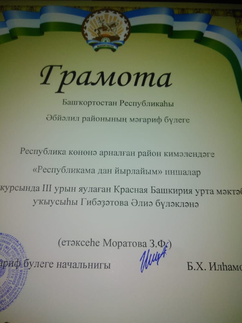 Ученица 7Б класса заняла ТРЕТЬЕ место в районном литературно-творческом конкурсе сочинений "Пою мою республику" на башкирском языке,посвященном Дню Республики Башкортостан и 90-летию Абзелиловского района.